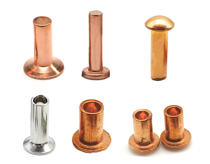 réz szegecsek, beleértve:réz szilárd szegecsek, félig tubuláris szegecsek, lapos fej réz szegecsek, kerek fej réz szegecsek, countersunk fej réz szegecsek, gombafej réz szegecsek, Pan Head Réz szegecsek, rácsos fej réz szegecsek, univerzális fej réz szegecsek stb.